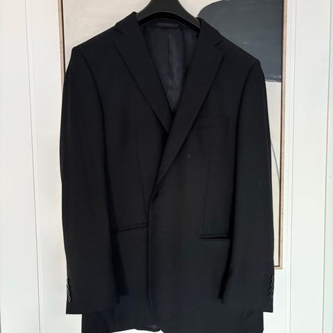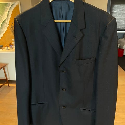 Tilsvarende blazere fra dette merket selges på deres nettside fra 14 000 - 20 000 kr. Blazeren er mørkeblå, med brede slag og funksjonelle lommer. Stoffet er en luftig men slitesterk ullblanding fra Paulo Olivera. Perfekt til både mer og mindre formelle anledninger.