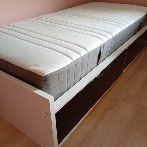 Jysk enkeltseng med oppbevaringsskuffer. Sengen har hodegavl og er i grå og hvit utførelse. Under sengen er det to uttrekkbare skuffer som gir oppbevaringsplass. Passer som enkeltseng på soverom, barnerom eller gjesterom. Madrass følger med, og mål bør kontrolleres mot annonsens øvrige informasjon.