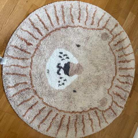 Jysk rundt teppe med bjørnemotiv. Teppe i sirkelform med frynser langs kanten og motiv av en bjørn i lyse og beige toner. Passer godt på barnerom eller som et lekent innslag i andre rom i hjemmet. Ny pris Ca 350 ( NB bør vaskes hvis du er allergisk mot katt)