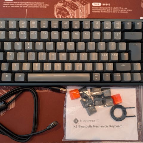 Sitter Gateron Smoothie switches montert. Kan også bytte de ut med Cherry MX Brown dersom det er ønskelig. Det er også montert O-ringer under hver keycap for å gjøre det stille og kontorvennlig.