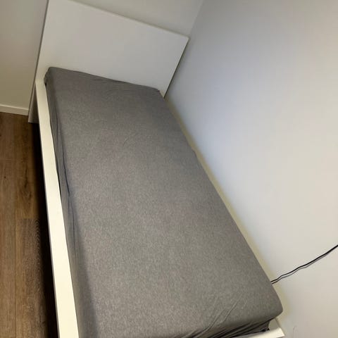 Den er pent brukt og ser nesten ny ut. Sengen er demontert, men skuffene og ribbebunnen er ferdig montert.