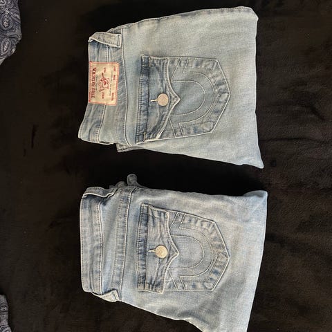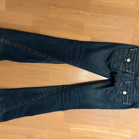 True Religion Joey jeans for dame i blå denim. Modellen er «Joey Low Rise Flare», med lav livhøyde og sleng i bena. Buksen har størrelse XS og livvidde W26. Klassisk 5-lommersmodell med knapp og glidelåslukking, kontrastsømmer og karakteristisk True Religion-baklomme. Egnet som hverdagsbukse eller til mer pyntede anledninger. Ny aldri brukt. Nypris mener jeg betalte 15 00kr selges hbo 800kr