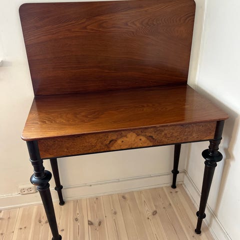 Antikk bord og 4 stoler selges samlet for 2000kr. Har vært i familiens eie siden det var nytt. Stolene er enkelt trukket om hjemme. Ca 100cm bredt, 100cm langt og 77cm høyt bort. Dessverre uten ileggsplate. Små hjul på bunnen av hvert ben. Disse burde renses og smøres.