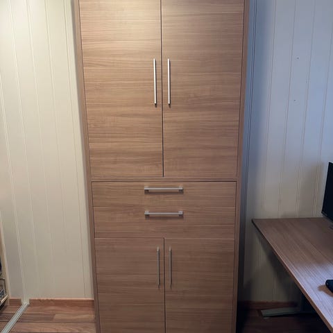 PC skap /dataskap i tre med skjerm øverst, uttrekkbar plate for tastatur, hyller og plass til PC og utstyrt nederst.