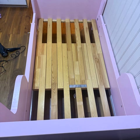 IKEA juniorseng i rosa farge. Sengen har hel sengegavl og fotgavl med avrundede kanter. Passer til barn som har vokst ut av sprinkelseng og over i juniorseng. Egnet for barnerom. Madrass og sengetøy følger eventuelt med etter avtale mellom kjøper og selger.