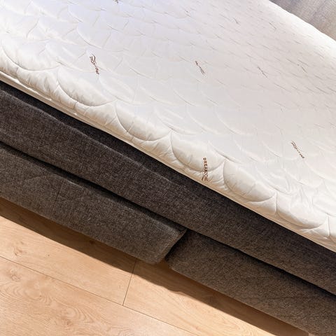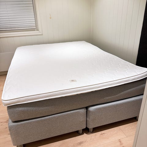 1år gammel, lite brukt stått på gjesterom med ekstra madrasser oppå + overmadrass og madrassbeskytter så aldri sovet direkte på overmadrass, fremstår som ubrukt.