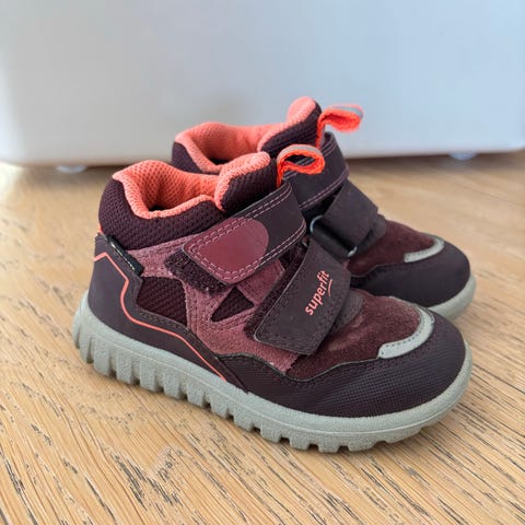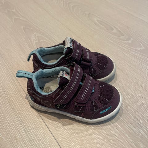 Viking barnesko med Gore-Tex-membran i størrelse 20 for unisex. Skoene har overdel i tekstil og syntetisk materiale i burgunderfarge med lyse detaljer. Lukkes med to borrelåsremmer over vristen for enkel av- og påkledning. Yttersåle i gummi med mønster for bedre grep. Polstret kant og innside for økt komfort. Egnet som hverdagssko og utesko for små barn.