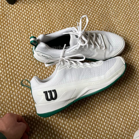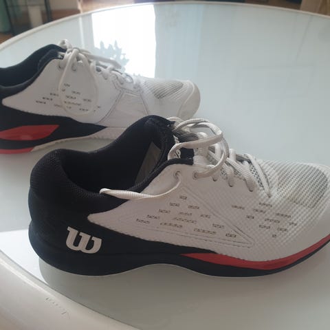 Brukt få ganger og selges da de er for store. Skoene har overdel i pustende meshmateriale og yttersåle med mønster tilpasset tennisbane. Lav modell med lisser for justerbar passform. Passer til bruk på tennisbane og annen racketsport der det er behov for stabile innendørs- eller utendørssko.