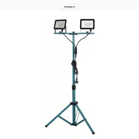 Arbeidslampen har LED-lyskilde og er montert på et stativ med bærehåndtak med skumgummigrep. Lampen leveres med strømadapter som kobles til via kabel. Hode og stativ kan justeres for å rette lyset der det trengs.