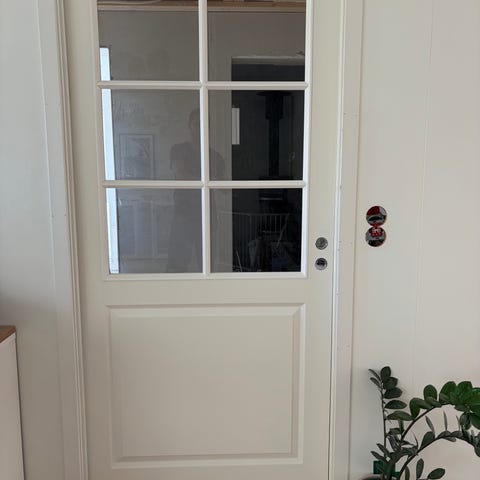 Hvit innerdør fra Swedoor med seks glassfelt i øvre del og tett fylling nederst. Døren har klassisk utforming med profilert ramme og leveres med dørhåndtak og låskasse montert. Passer som innerdør i bolig, for eksempel mellom stue, gang eller kjøkken, der man ønsker lysgjennomgang mellom rom.