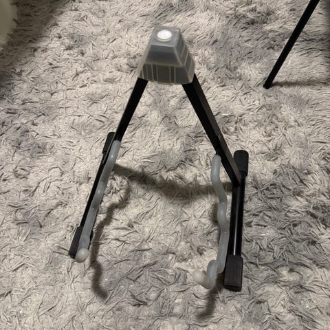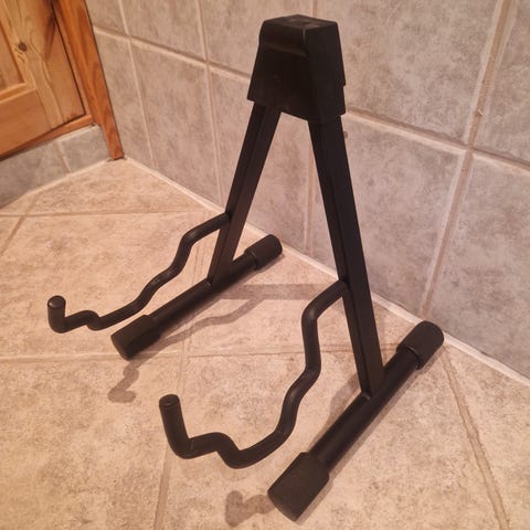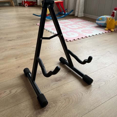 Sammenleggbart gitarstativ i svart utførelse. Stativet er konstruert i metall med polstrede kontaktpunkter for å beskytte instrumentet. Egnet for å holde gitar eller lignende strengeinstrument stående stødig på gulvet når det ikke er i bruk. Kan foldes sammen for enkel lagring og transport.