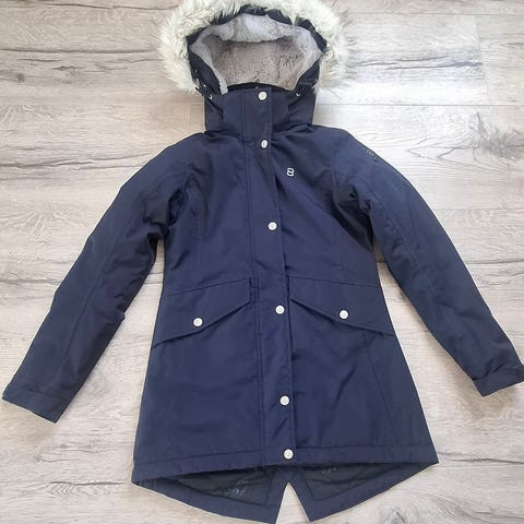 Flott boblejakke med snølås, avtagbar hette, ekte pels og lomme til slalomkort i ermet.