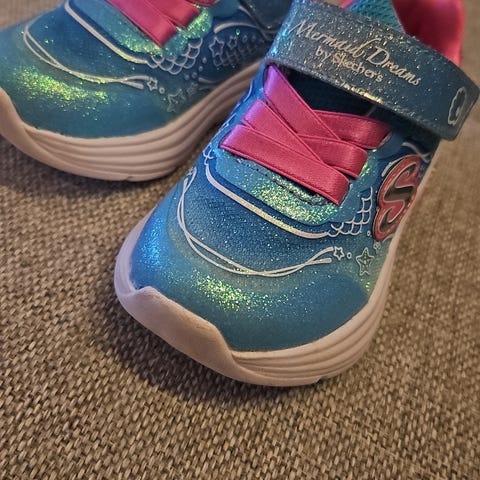Skechers joggesko for jente i blå og rosa farger. Skoene har overdel i tekstil og syntetisk materiale med glitterdetaljer og dekor på sålen. De har borrelås og elastiske lisser for enkel av- og påtaking, samt polstret innersåle og hælkappe for økt komfort. Egnet som hverdagssko og fritidssko for barn.