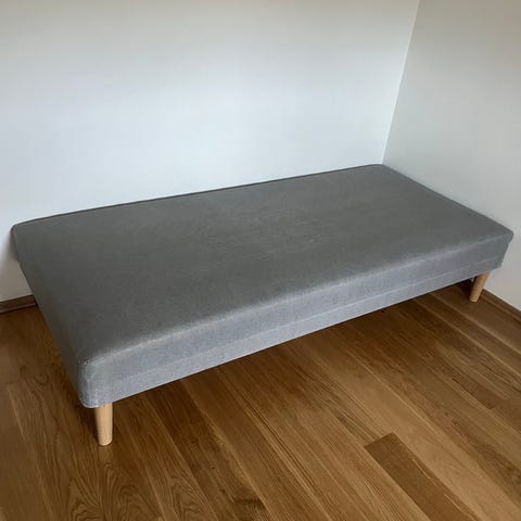 Sengen er 200 x 90 cm. Den har noen merker langs den ene siden, slik bildet viser. Dette kan helt sikkert vaskes bort. Utover dette er det ingenting å utsette på sengen. Pent brukt.