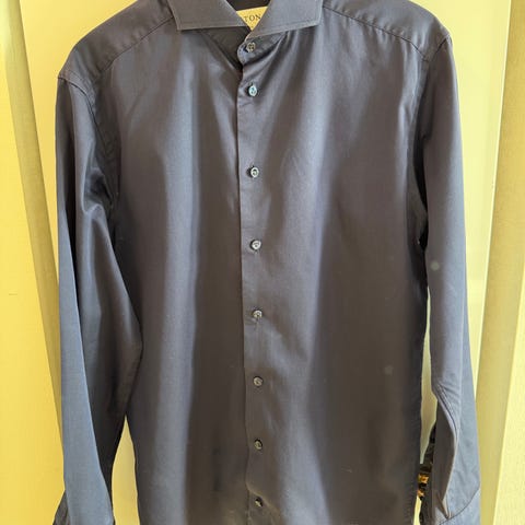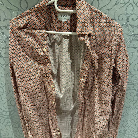 Eton skjorte for herre i størrelse M. Skjorten er flerfarget med mønster og er laget av bomull. Modellen har klassisk krage, lange ermer med mansjetter og knappelukking foran. Passform er merket som slim. Egnet til bruk både til hverdags og mer formelle anledninger der en mønstret bomullsskjorte ønskes.