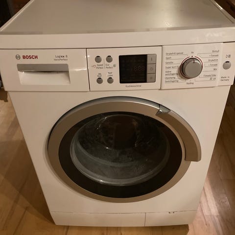 Bosch frontmatet vaskemaskin i hvit utførelse. Maskinen har frontåpning med glassluke og rustfri trommel. Godt brukt, men fungerer som den skal :).