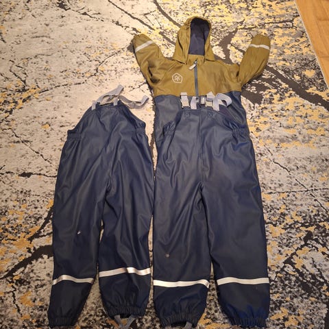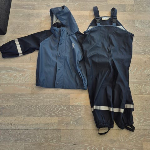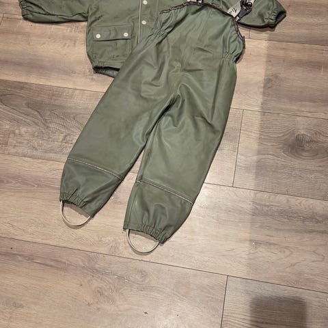 Lindex regnsett for barn i størrelse 128, unisex. Sett med jakke og selebukse i grønn polyester. Jakken har hette og fôr på innsiden, samt trykknapper foran. Buksen har seler og strikk nederst i bena. Refleksdetaljer på bukseben gir bedre synlighet. Egnet som yttertøy i vått vær for barn rundt størrelse 128.