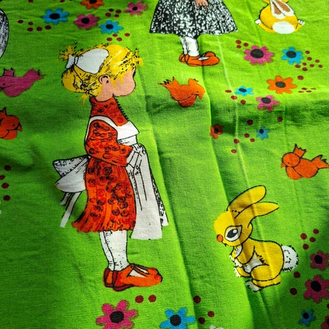 Tekstilet har grønn bunnfarge med illustrasjoner av hus, trær, blomster, dyr og tog i sterke farger. Passer til barnerom.