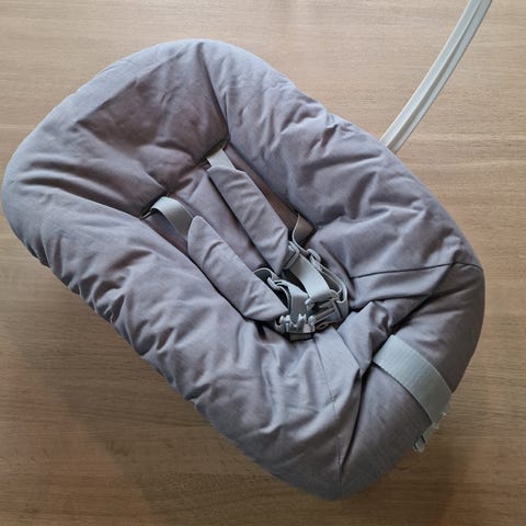 Stokke Tripp Trapp Newborn sete i grå tekstil selges. Setet er beregnet for nyfødte og små babyer og festes på Stokke Tripp Trapp stol. Den har polstret sete med integrert sele og hvit plastbase med ventilasjonsåpninger. Egnet som ligge-/hvileløsning for spedbarn ved spisebordet sammen med resten av familien, i kombinasjon med Tripp Trapp stol. Tilbehør til å henge leke i følger med.