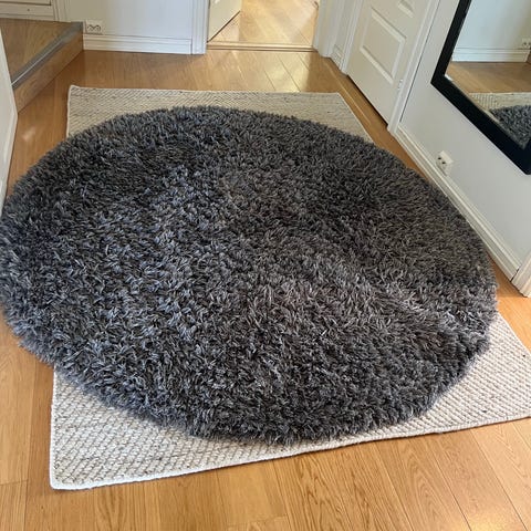 Helt ny, kun åpnet for å prøve. Kjøpt for 1399 kr. Mye finere farge enn det på bildet. Ombestemte meg og tenker heller å gå for en annen form. Teppets form er rund og det har en tykk, lang lugg som gir en myk overflate. Passer til bruk i stue, soverom eller andre oppholdsrom der man ønsker et mykt teppe på gulvet.