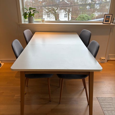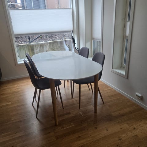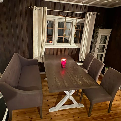 Spisestuen er fin men med noen synlige merker. Stolene fungerer godt og er gode og sitte i. Men er litt slitte.