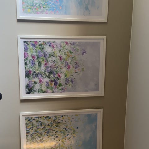 Kunsttrykk med motiv av blomster i vase. Bildet viser detaljerte blomster i lyse og mørke fargetoner mot en lys bakgrunn. Trykket er innrammet bak glass. Egner seg som veggdekor i stue, gang eller andre oppholdsrom.