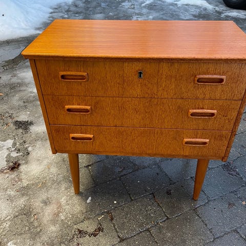 Liten teak kommode med synlige bruksmerker, beina er litt skeive, den står men må kanskje rettes opp med en skrue eller to.