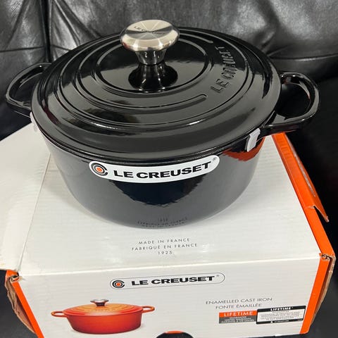 Le Creuset gryte i støpejern med lokk. Diameter 24 cm. Farge svart. Gryten har to håndtak og lokk med metallknott. Egnet til tilberedning av gryteretter, steking og langsom koking på ulike varmekilder, inkludert ovn, i henhold til produsentens anbefalinger for støpejernskokekar.