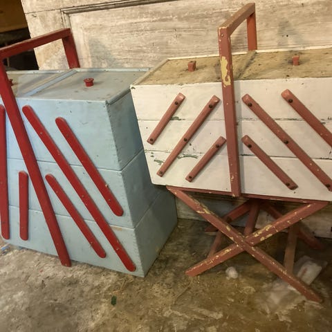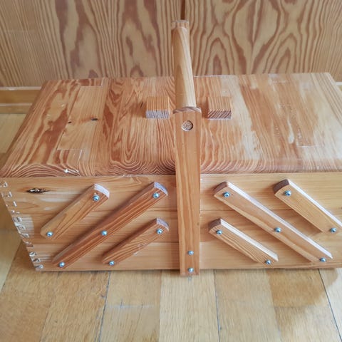 Et vakkert vintage syskrin laget av heltre, med en klassisk utvidbar, men solid konstruksjon og et bærehåndtak. Skrinet har et sammenleggbart design med tre nivåer og skillevegger for organisering av småting.