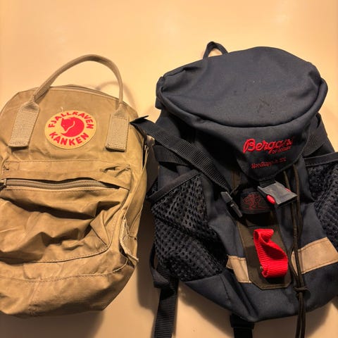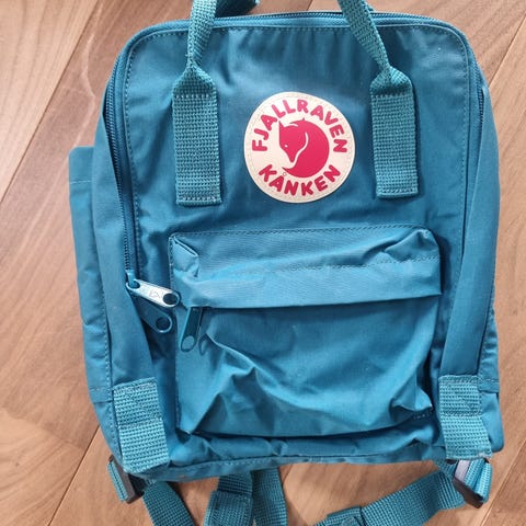 Fjällräven Kånken Mini ryggsekker i to farger, én grønn og én lyseblå. Klassisk Kånken-design med topphåndtak, justerbare skulderstropper og glidelåsåpning til hovedrommet. Hver sekk har frontlomme med glidelås og to åpne sidelommer. Innvendig sitter et uttakbart sitteunderlag som også fungerer som ryggstøtte. Passer til barn