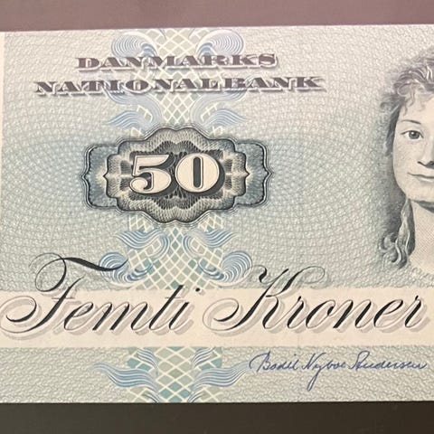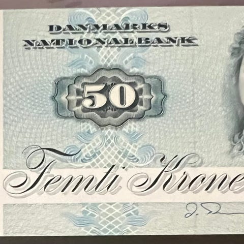 Danmark 50 kroner seddel. Forsiden viser pålydende verdi 50 kroner med dekorative mønstre og teksten "Danmark" og "Femti kroner". Baksiden har motiv av et landskap med steinformasjoner og trær. Egner seg som samleobjekt for mynter og sedler eller som historisk illustrasjon av dansk valuta.