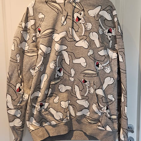 H&M hettegenser for herre i størrelse 170. Genseren er hvit med svart mønster/print over hele plagget. Laget i bomull.. Klassisk hette og kengurulomme foran. Ribbekanter nederst og på ermene. Passer til hverdagsbruk og fritid.
