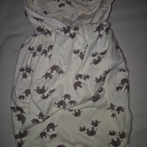 Original Swaddle Elephant svøpepose for baby 0–3 måneder. Passer vekt ca. 3,2–6,4 kg og lengde ca. 48–58,5 cm. Svøpeposen er laget av 100 % bomull og har hvit bunnfarge med elefantmønster.