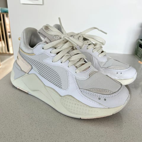 Puma RS-X sneakers i hvit, beige og gull, størrelse 38.