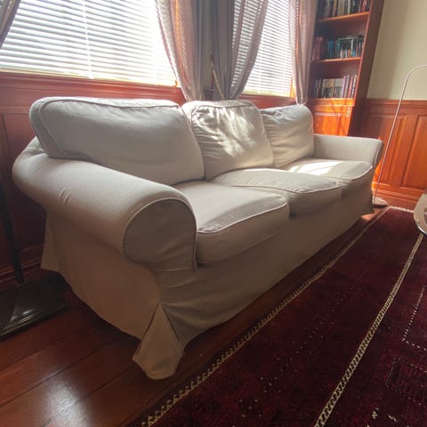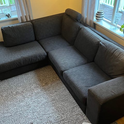 Blå sofa gis bort. Avtakbare trekk på ryggputer og sitteputer.