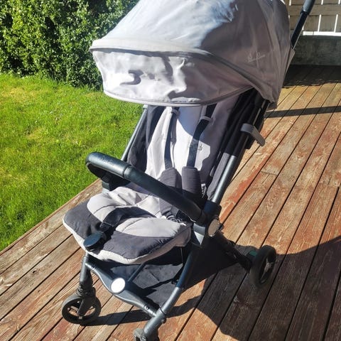 Lett og praktisk vogn som tar liten plass. I veldig god stand, ingen skader.Ryggen kan legges nesten helt flatt. Regntrekk følger med. Enkel å ta opp og ned.