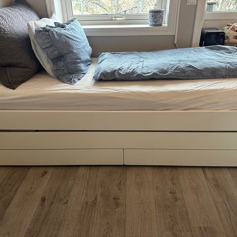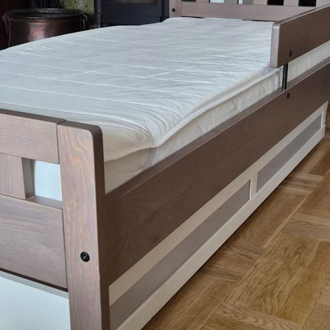 Bohus juniorseng med integrerte oppbevaringsskuffer under liggeflaten. Skuffene gir ekstra lagringsplass til for eksempel klær, leker eller sengetøy. Nøytral utførelse som passer inn på de fleste barnerom.