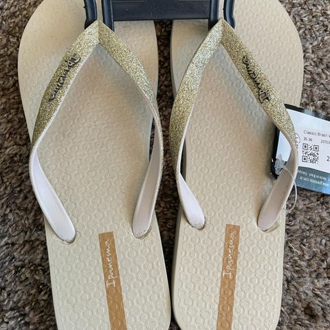 Helt nye Havaianas sandaler i størrelse 37. Modellen har tynne remmer rundt ankelen og en bredere rem over vristen i metallisk gullfarge. Sålen er beige med mønstret overflate for bedre grep, og undersiden har rillet struktur. Sandalene er laget i syntetisk materiale/ gummi som er typisk for Havaianas.