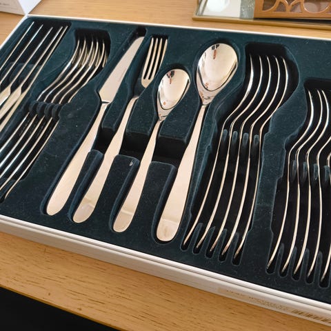 Bestikksett i rustfritt stål med hvite håndtak på knivene.