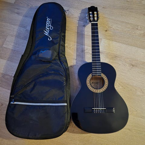 Morgan akustisk gitar i svart utførelse. Klassisk kroppsform med nylonstrenger og gripebrett i tre. Gitaren leveres med polstret bærebag som har glidelås og bærestropper. Passer til generell spilling, øving og undervisning for både nybegynnere og viderekomne.
