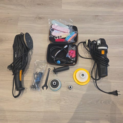 Poleringsmaskiner: FLEX (XFE 7-15) og RUPES Bigfoot (LHR 75E). Begge er nesten som nye, kun brukt på to biler. Fungerer feilfritt.