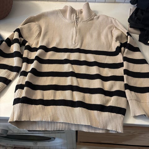 H&M genser for barn i størrelse 98. Unisex-modell i ribbestrikket bomull. Genseren er flerfarget med brede striper i lyse og mørke toner. Materiale: 100 % bomull. Passer til hverdagsbruk for både gutter og jenter.