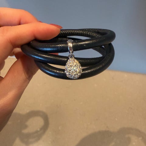 Armbånd med en sølv charm med stener, ikke Ole lynggaard. 38 cm langt med knute. Ingen slitasje.