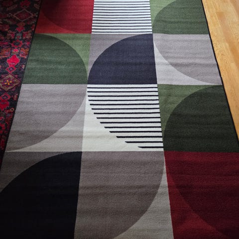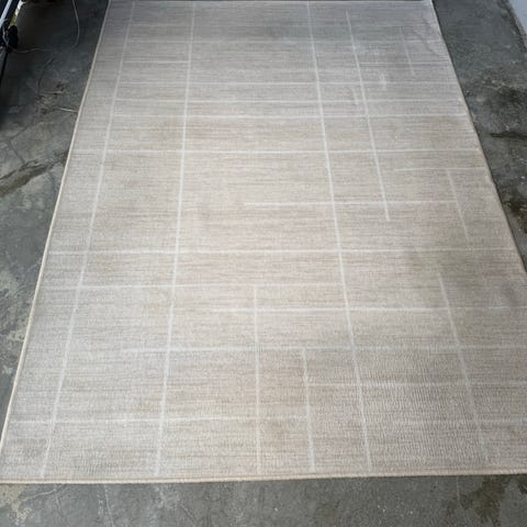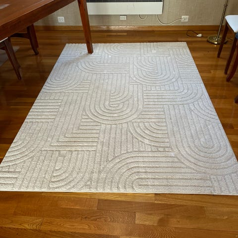 Rusta teppe i rektangulær form med lys beige bunnfarge og et ton-i-ton geometrisk mønster med buede linjer. Passer til bruk i stue, soverom eller gang. Materiale og nøyaktige mål er ikke oppgitt av selger.