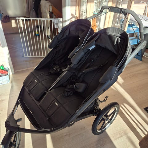 Thule tvillingvogn i svart farge. Vognen har to sitteenheter ved siden av hverandre med individuelle seler. Store bakhjul og svingbart forhjul gir god stabilitet og manøvrering. Egnet for transport av to barn samtidig, for eksempel til hverdagsbruk, trilleturer og turer på jevnt underlag.