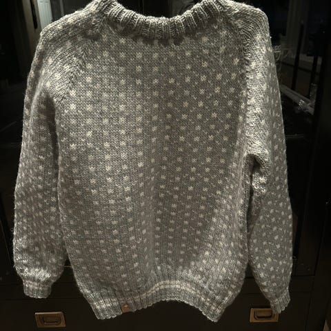 Selger denne fine ullgenseren fra Sandnes Uldvarefabrik (1888-1986), dagens Sandnes Garn, som er håndstrikket av 100% ull. Dette er altså virkelig en vintage genser. Den har 3/4 armer, og er kort i lengden. Den er kjøpt brukt så muligens den er ment til barn, men jeg har brukt den når jeg var en str. XS. Den har ikke en eneste flekk og ingen slitasje, fremstår som ny. Lengde genser: ca. 50 cm. Lengde armer: ca. 50 cm. Farge: eggehvit/grå