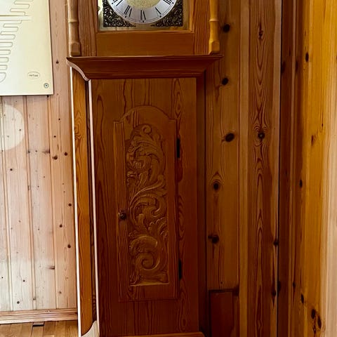 Langt veggur gulvur i tre med pendel. Klokken har et høyt skap i heltre med dør i front som gir tilgang til pendel og lodd. Urskiven har romertall og dekor rundt, samt separat sekundviser. Over urskiven er det et malt motiv i buen. Kabinettet står på sokkel og har enkle utskjæringer og innfelte hjørnedetaljer nederst. Passer som gulvur i stue, gang eller andre rom der man ønsker et tradisjonelt, mekanisk ur med pendel.