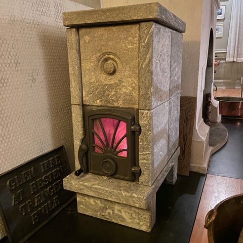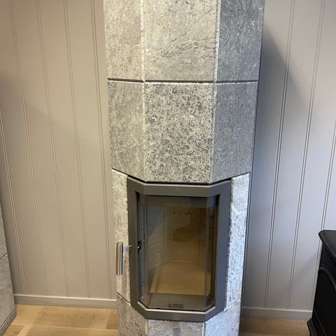 Peisovn i kleberstein med grå overflate. Ovnen har stor glassdør i front og sideglass som gir innsyn til flammene fra flere vinkler. Klebersteinen fungerer som varmelagrende materiale og bidrar til jevn varmeavgivelse over tid. Passer som vedfyrt varmekilde i oppholdsrom der man ønsker både oppvarming og innsyn til ildstedet.