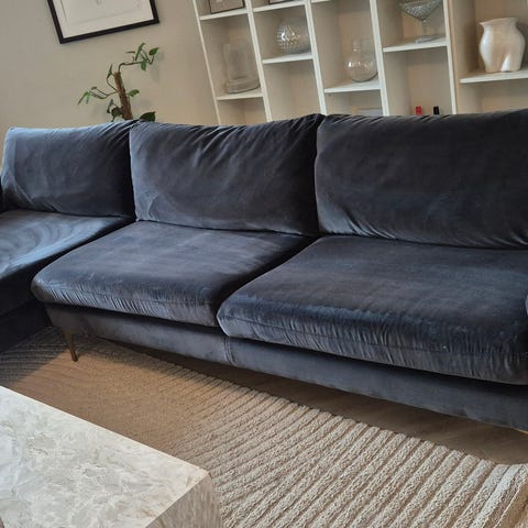 Pen blå sofa med sjeselong selges. Litt katteskade synlig på armresten (siste bilde), ellers pent brukt og i god stand. Må hentes. Enkel tilgang med bilen, første etasje.