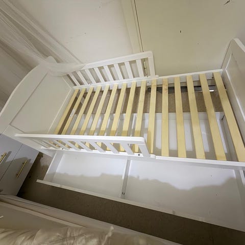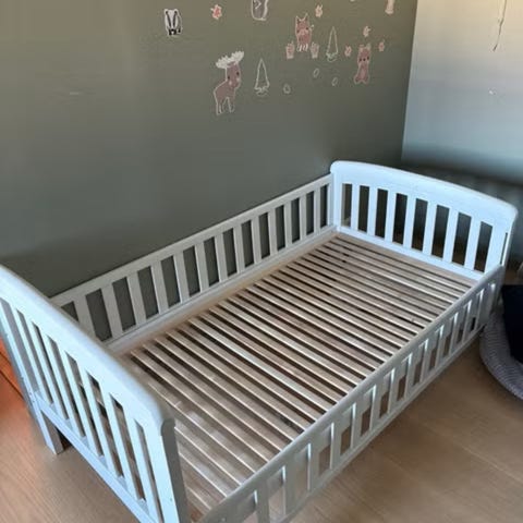 Juniorseng i hvitmalt tre. Sengen har klassisk hode- og fotende med utskårne detaljer og sengebunn i trelameller. Passer som overgangsseng mellom sprinkelseng og vanlig seng for barn. Den kan trekkes ut og kan derfor vare i mange år. Sengehesten og skummadrassen kan følge med. Det er en flekk på madrasstrekket. Det følger også med dyne 100×140 og 3 sengetøy med dyremotiver.